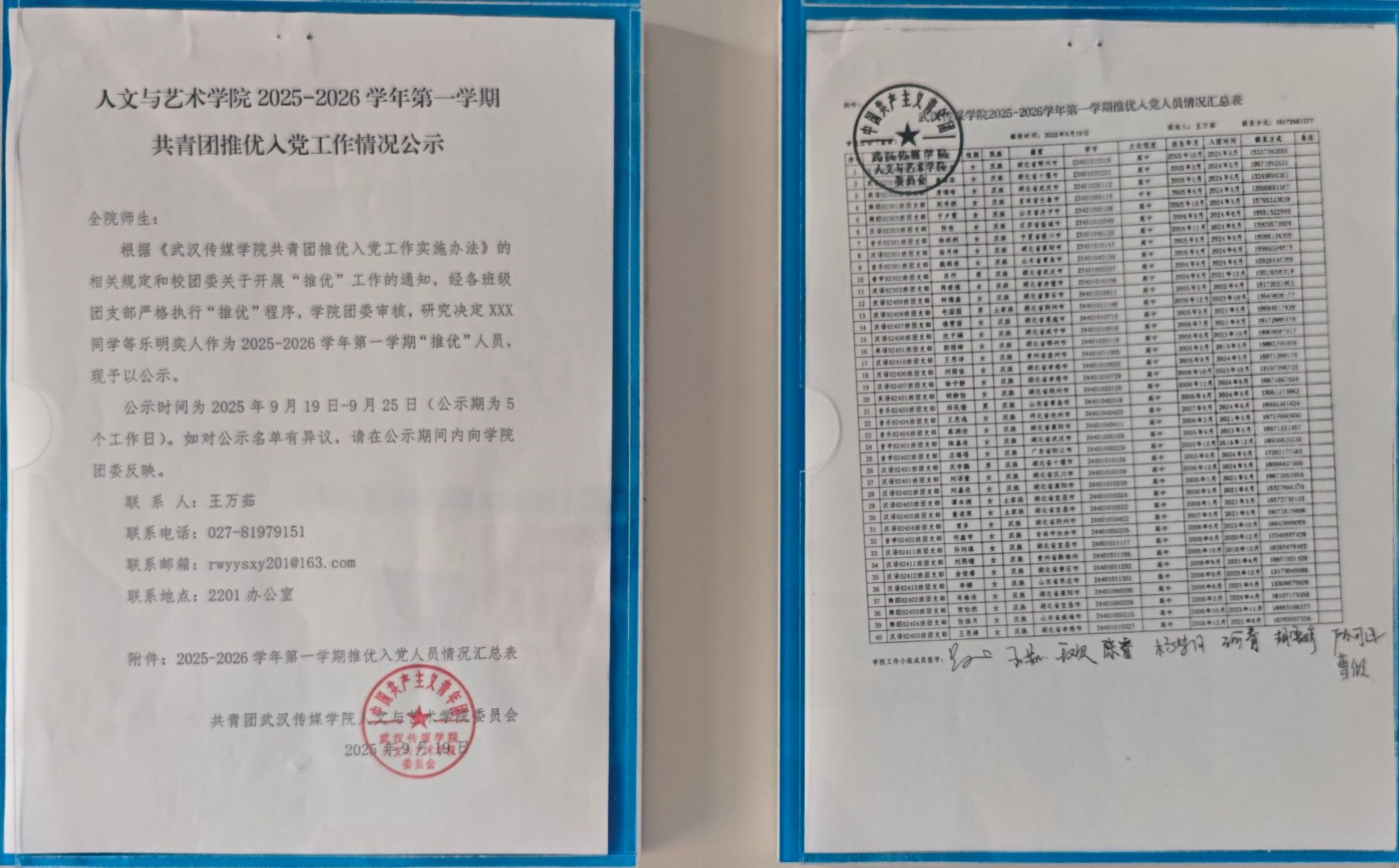 人文与艺术学院2025-2026学年第一学期共青团推优入党工作情况公示