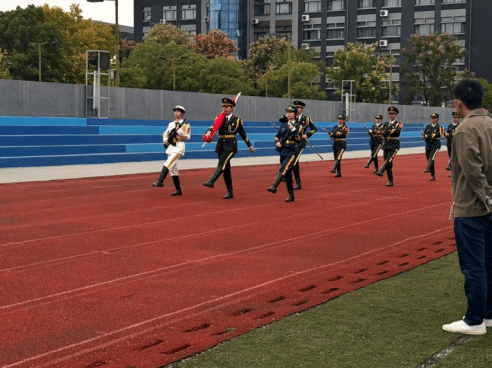 英姿勃发的国旗护卫队列队迈向升旗台,良好精神风貌中满是对祖国的热爱。伴随激昂国歌,五星红旗冉冉升起,全体师生行注目礼并齐唱中华人民共和国国歌。