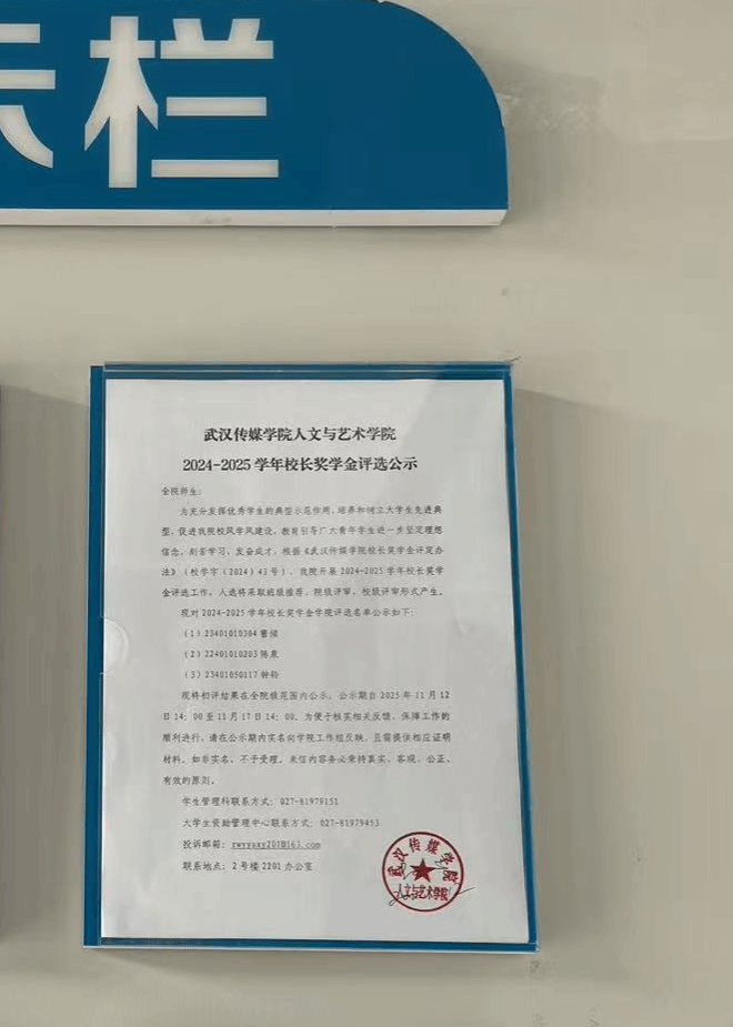 武汉传媒学院人文与艺术学院2024-2025学年校长奖学金评选公示