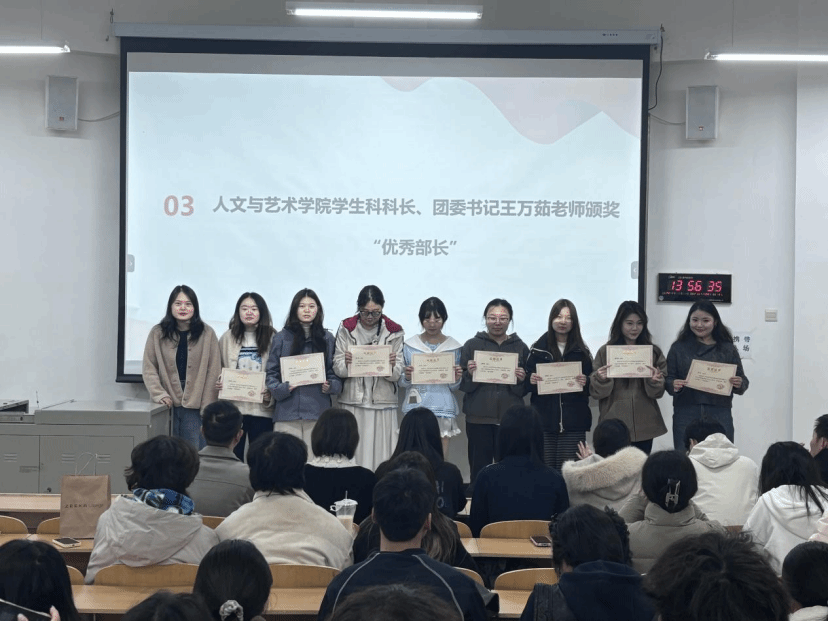 随后,人文与艺术学院学生科科长、团委书记王万茹老师迈着稳健的步伐,缓步走向颁奖台。在台下众多期待的目光中,王老师逐一为每一位优秀部长颁发荣誉证书,用这一庄重而温馨的仪式,充分肯定了他们在学生会工作中所付出的辛勤努力以及取得的卓越成就。