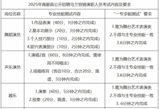 本次面向社会公开招聘乌兰牧骑演职人员25名,纳入事业编制管理。具体岗位详见附件《2025年商都县公开招聘乌兰牧骑演职人员岗位表》(以下简称《岗位表》附件1)。