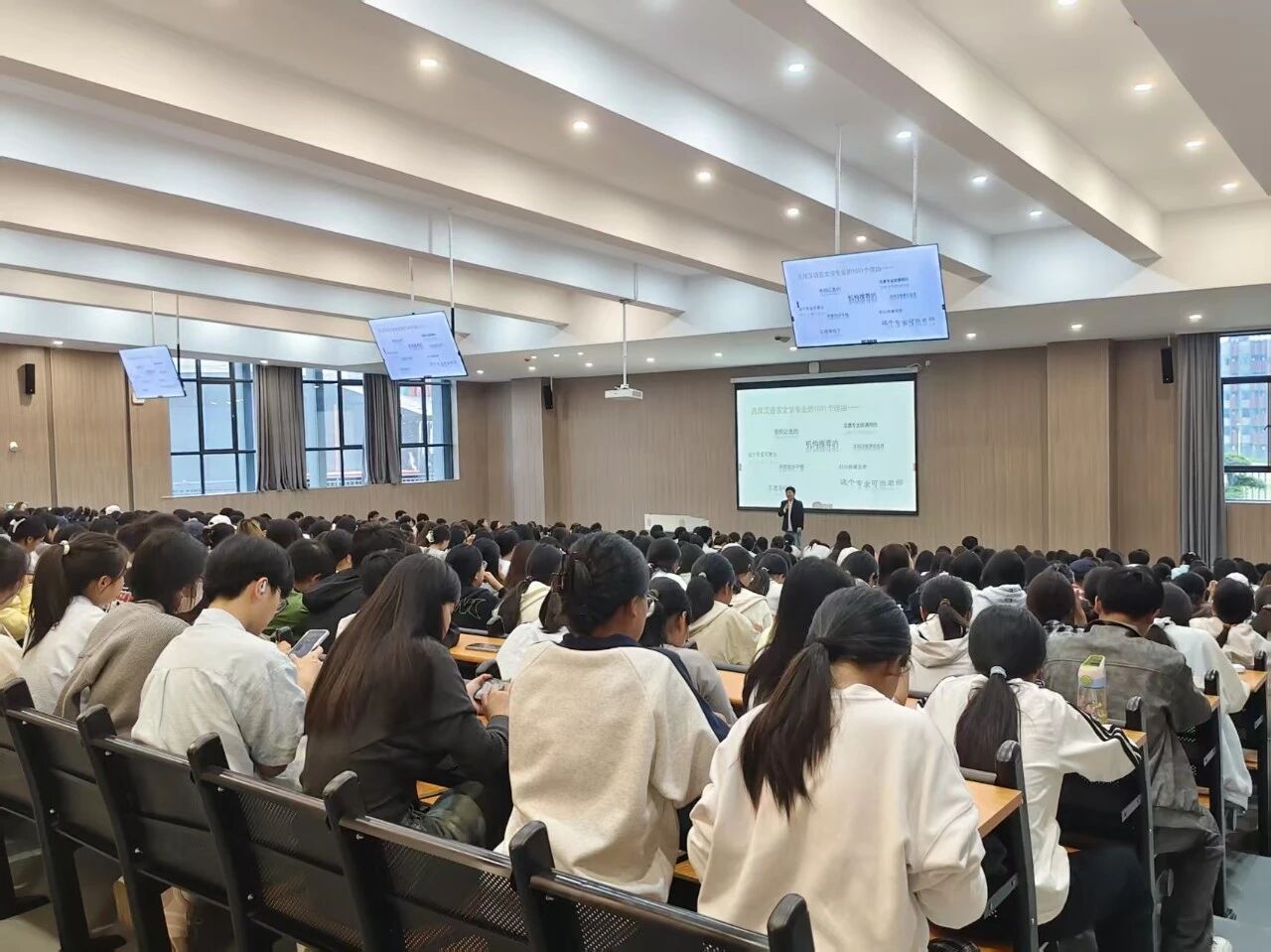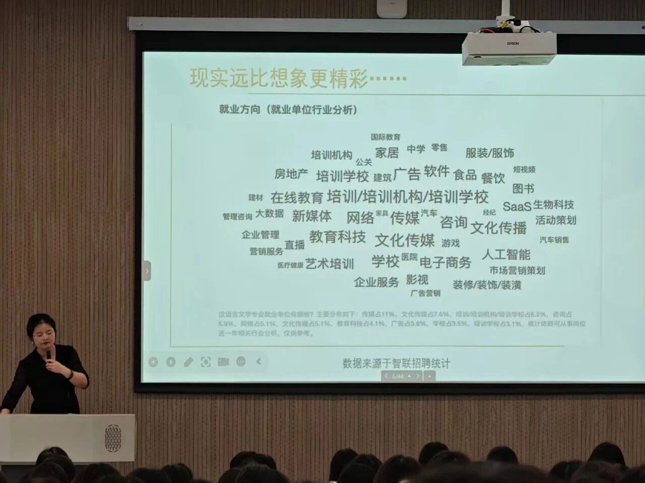 在专业宣讲会上张老师形象地将大学四年的学习路径比作 “铸钥胚”“刻齿纹”“加模块”和“试锁孔”,对应大一通识筑基、大二专业深入、大三方向适配与大四实战淬炼四个阶段。强调汉语言文学专业将通过系统的课程设置与多元的实践平台,着力培养具有扎实理论基础、文化深度和批判性思维的高素质应用型人才。此外,张老师还结合历年就业数据,为新生指明了发展方向,鼓励大家“低头拉车,抬头看路”,踏实走好大学每一步。