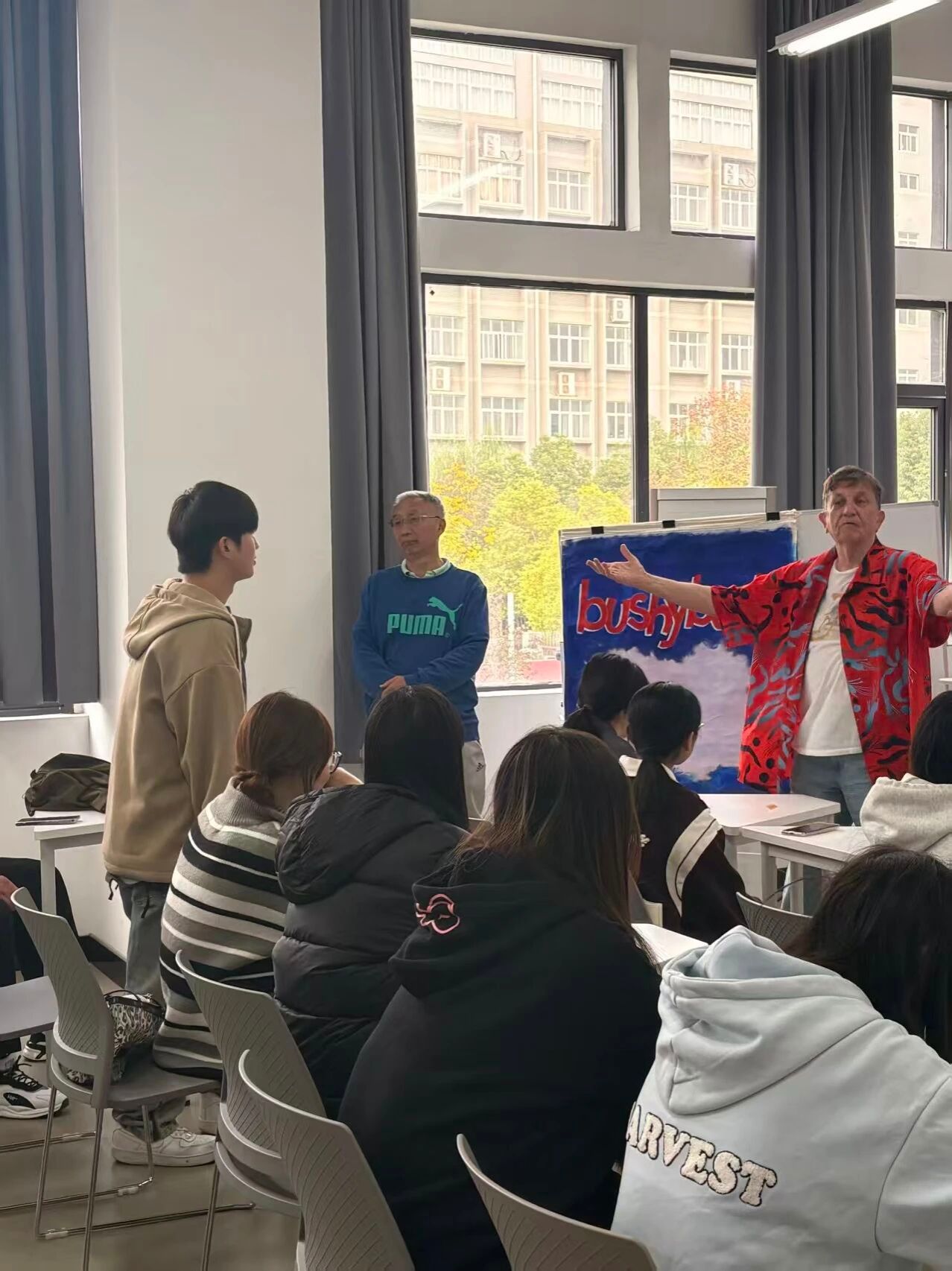当澳大利亚的艺术热忱撞上中文诗歌的韵律,当经典名著的书页与共创画作的笔触交织——2025年11月12日下午,澳大利亚知名画家菲利普先生莅临人文与艺术学院,与我院英语专业的学生们上演了一场跨越国界的文化共振。