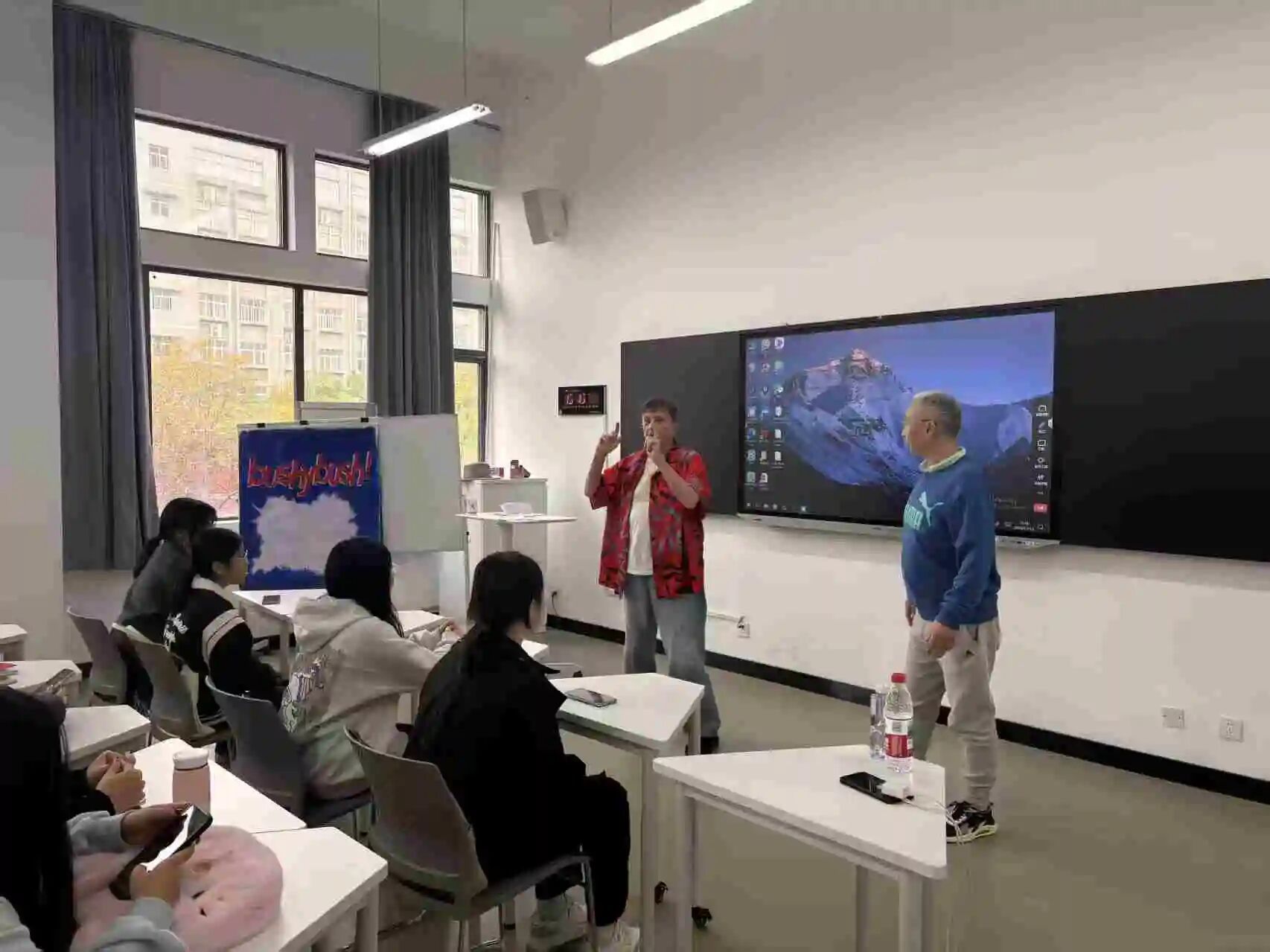 当菲利普先生在大屏幕放出轻快的旋律,邀请大家跟着节奏摆动,课堂瞬间变成了小型派对。有人先跟着轻踩地板,接着有人抬手打节拍,原本端坐着的讲座,眨眼变成了挤着温暖的小型派对。歌声里,大家不再是捧着笔记本的听众,而是和这位远道而来的艺术家并肩的“创作搭子”。