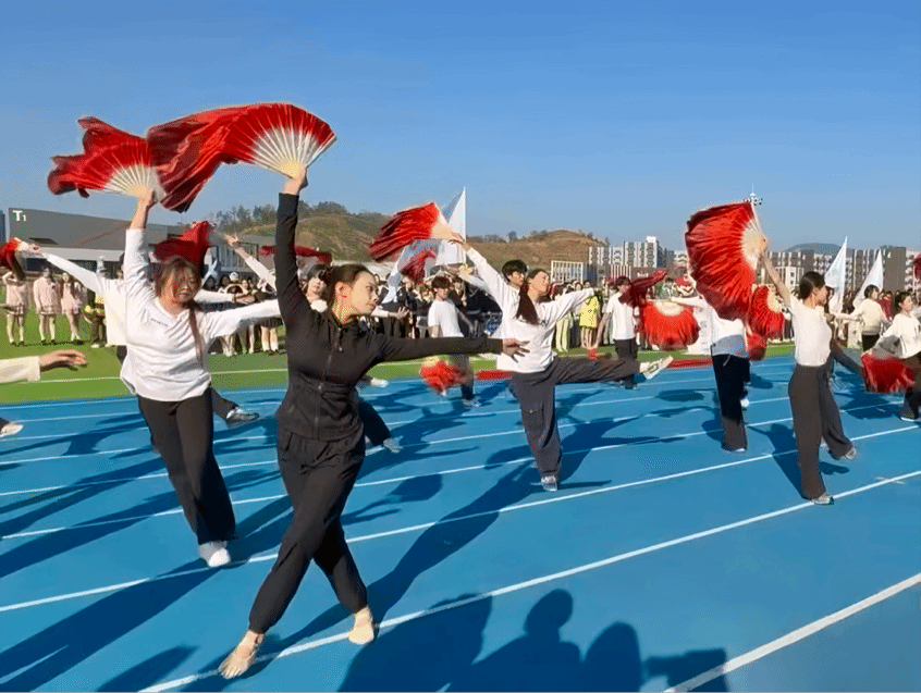 开幕式上,人文与艺术学院方阵踏着铿锵的步伐惊艳亮相。同学们衣着简约中透着文艺气息,“坚守信念、胸怀全局、团结奋进、勇当前锋”的大别山精神,随步伐激荡全场!扇面开合间,或绘山河诗意,或展笔墨书香,队列变换中展现灵动的舞姿,将书香雅韵与人文艺术的灵动创意巧妙融合。旗手高擎院旗,步履间的默契与朝气,身姿里藏着薪火相传的奋进力量,充分展现了文艺人的精神风貌与集体凝聚力,引得看台上掌声不断。