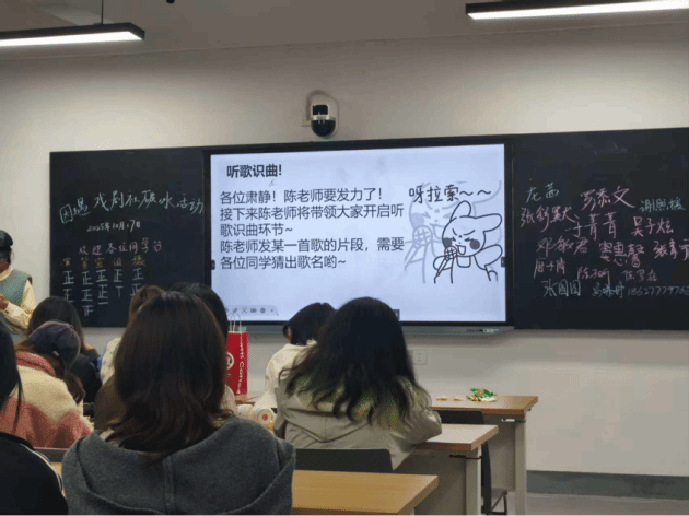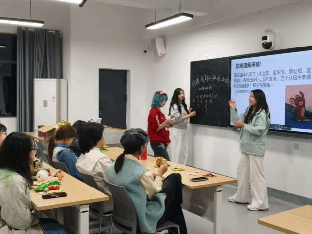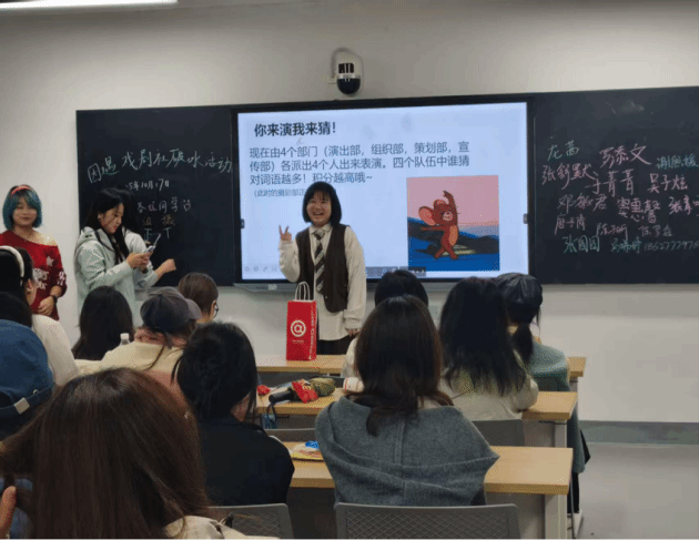 破冰环节设计别出心裁,三个创意游戏层层递进,将现场气氛不断推向高潮。“击鼓传花”环节,随着鼓点起落,一朵小小挂件在新社员手中快速传递,被选中的同学或展示才艺,或分享故事,现场掌声与欢笑不绝于耳。“你画我猜”游戏中,同学们用生动形象的肢体语言诠释戏剧专业术语,在趣味互动中增进对戏剧艺术的了解。“听歌辨曲”环节则唤起大家的共同记忆,经典剧目插曲与知名电影配乐引发热烈讨论。