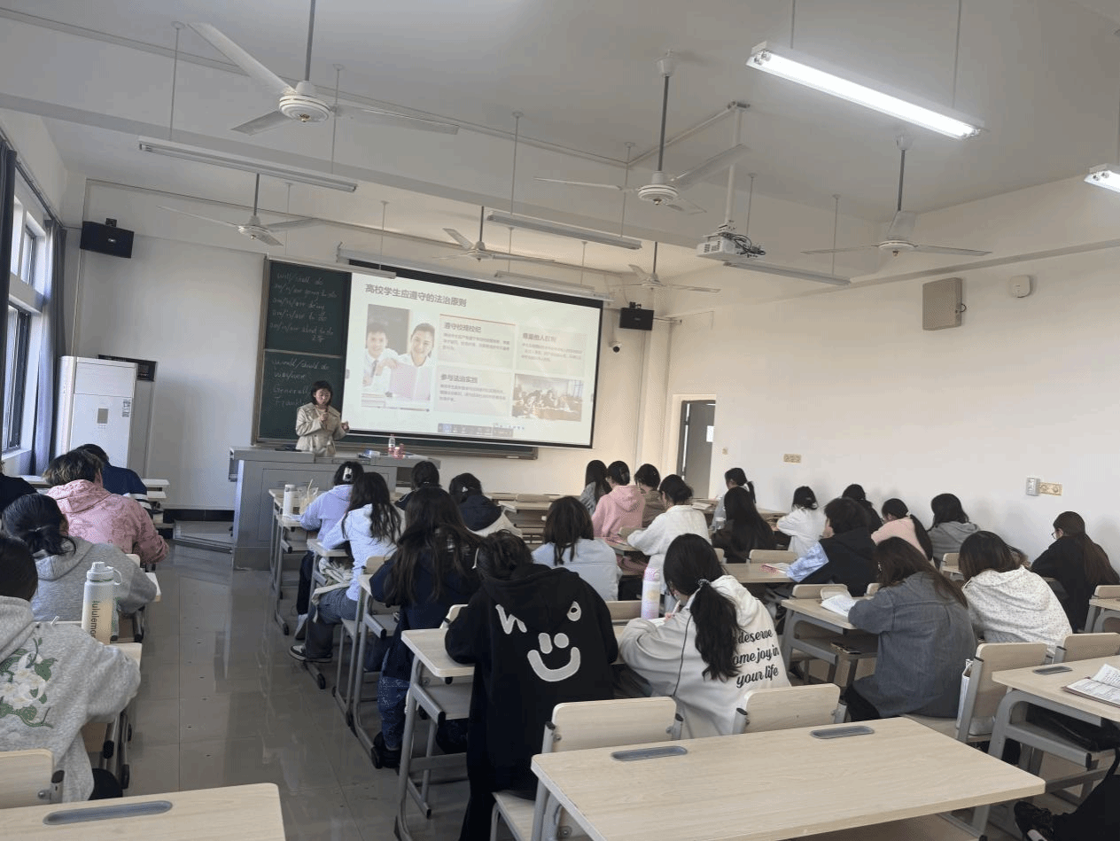 随后,荣金玉老师指出,要严守学术法治底线,杜绝抄袭、篡改数据等学术不端行为,将“尊重知识产权”融入科研学习全过程;要恪守网络法治准则,不造谣、不信谣、不传谣,在社交平台中保持理性发声,自觉抵制不良信息;要践行校园法治规范,在班级管理、社团活动中主动维护公平公正,以规则意识处理同学关系与集体事务。