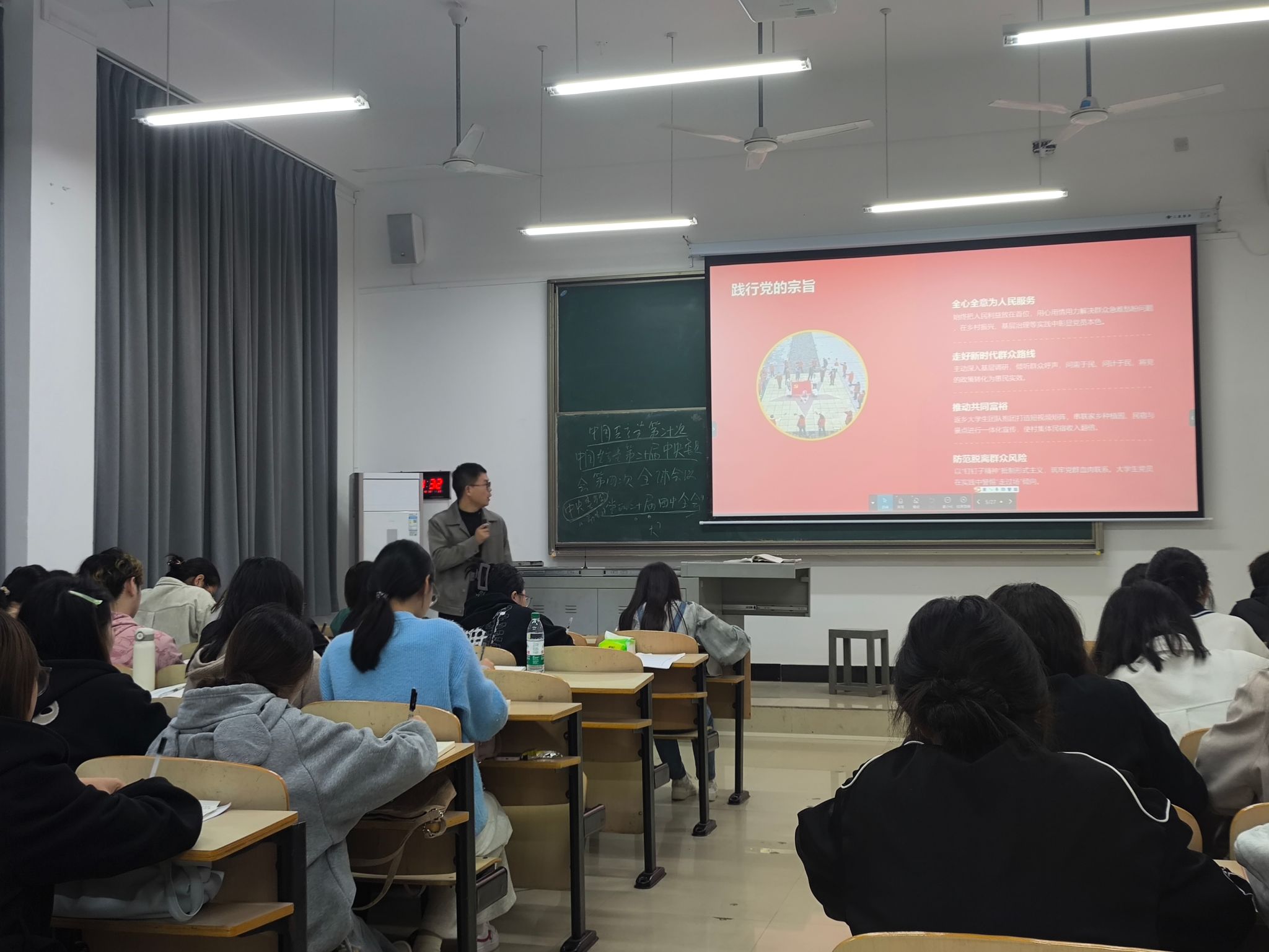 在践行党的宗旨部分,吴斌老师聚焦“全心全意为人民服务、推动共同富裕、防范廉政风险”等要点,号召青年党员立足岗位践行群众路线,在服务师生、奉献社会中诠释“人民至上”的价值追求。针对强化政治担当,提出“捍卫‘两个维护’、锤炼政治能力、勇担时代重任、严守纪律规矩”的行动指南,结合抗疫、乡村振兴等实例,展现青年党员在急难险重任务中冲锋在前的先锋本色。