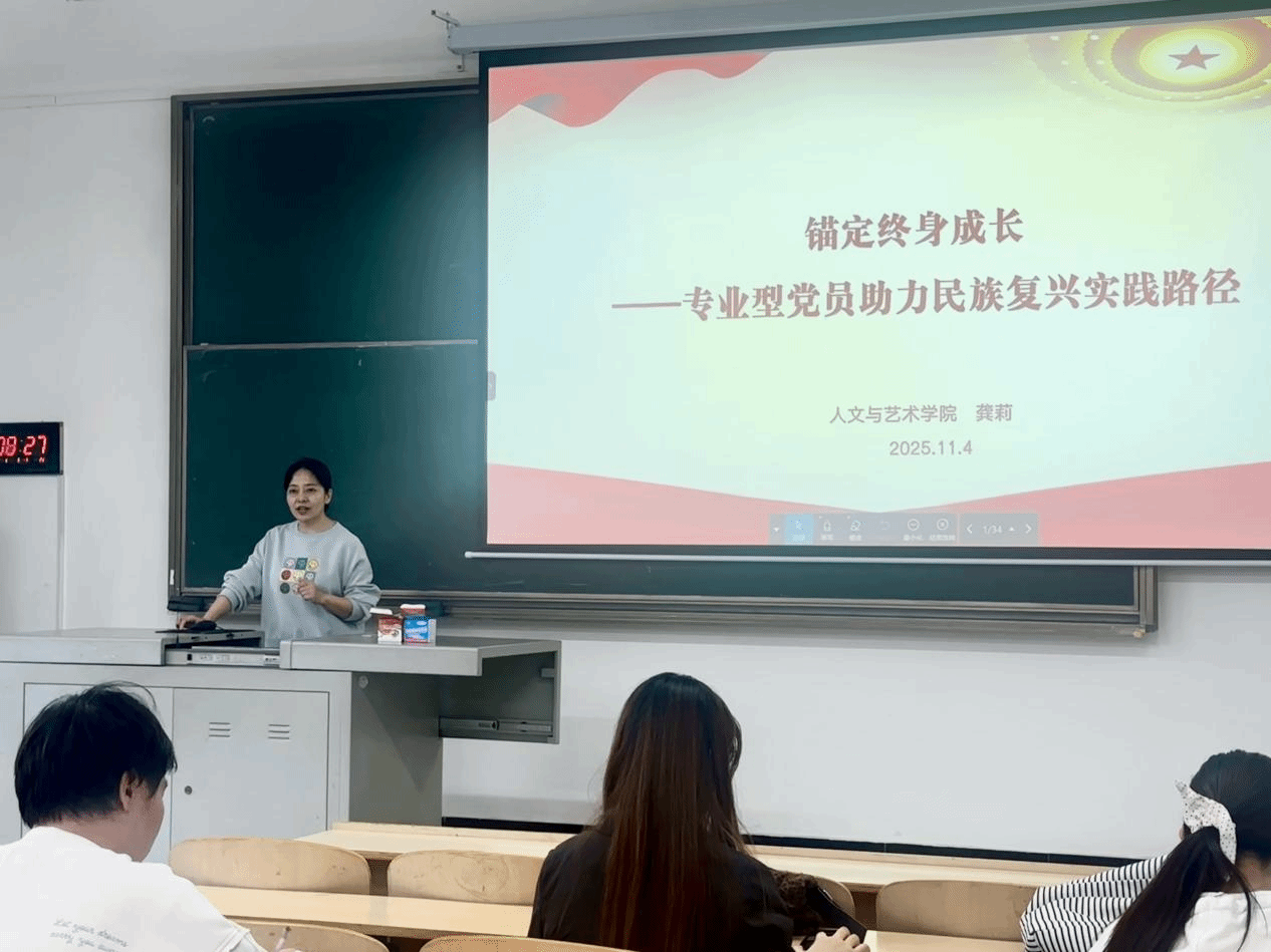 为深入探讨专业型党员在民族复兴中的角色与作用,人文与艺术学院分党校于11月4日开展了第二次党课的集中学习,此次党课由人文与艺术学院龚莉老师授课,以“锚定终身成长——专业型党员助力民族复兴实践路径”为题,讲授了专业型党员的时代特征、核心素养、实践路径以及未来发展等议题。