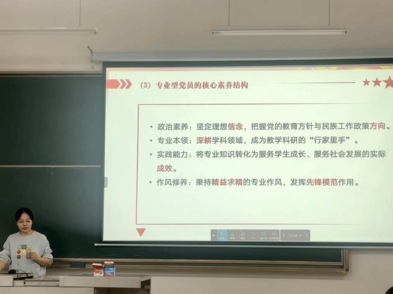 其次,龚莉老师重点探讨了专业型党员的实践路径。龚莉老师认为,专业型党员应将“学”与“行”相结合,以“学”为基,筑牢专业型党员成长之魂,通过政治理论学习的精准化路径、专业能力提升的系统化路径以及学习习惯养成的长效化路径,不断提升自身政治素养和专业本领。同时,以“行”为要,彰显专业型党员担当之为,在教书育人中践行初心使命,在社会服务中展现先锋本色,将专业知识转化为服务学生成长、服务社会发展的实际成效。