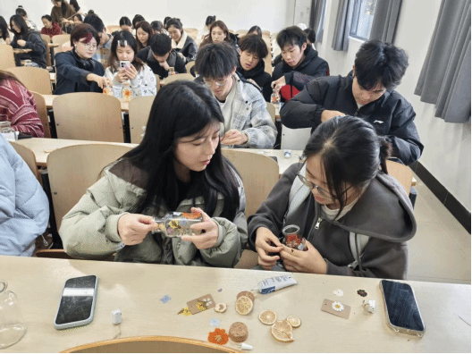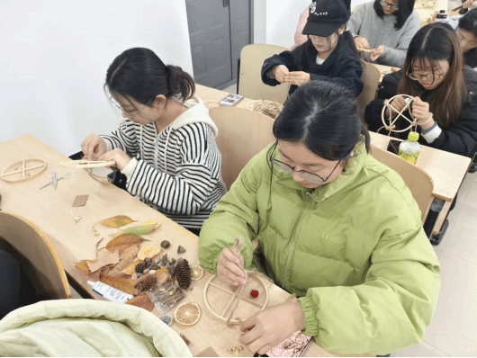此次活动旨在引导同学们在忙碌的学习与生活中,寻一方宁静时空,安放思绪,聆听内心。通过手作与自然的融合,实现情绪的整理与自我的表达。以手工制作为载体,鼓励同学们利用自然材料进行艺术创作。在轻松舒缓的氛围中,同学们亲手将干花、枝叶等自然元素精心布置于透明瓶中(“星光”干花玻璃瓶),或挂到树枝干上做成风铃(手作风铃)。每一件作品都成为个人情感与创意的独特寄托。活动过程中,大家奇思妙想,随心创作,不仅体验了艺术创作的乐趣,更在专注与静心中实现了压力的释放和情绪的疏导,感受到心灵与自然对话的平和力量。