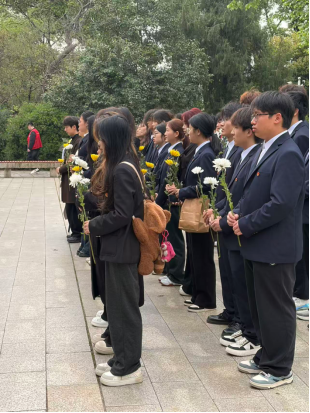 献花完毕,全体学子向为民族解放、工人运动事业英勇献身的施洋烈士默哀致敬。静默的一分钟里,饱含着对革命先烈的深切哀思与无限崇敬,更彰显着青年学子薪火相传革命精神、勇担时代使命的坚定信仰。