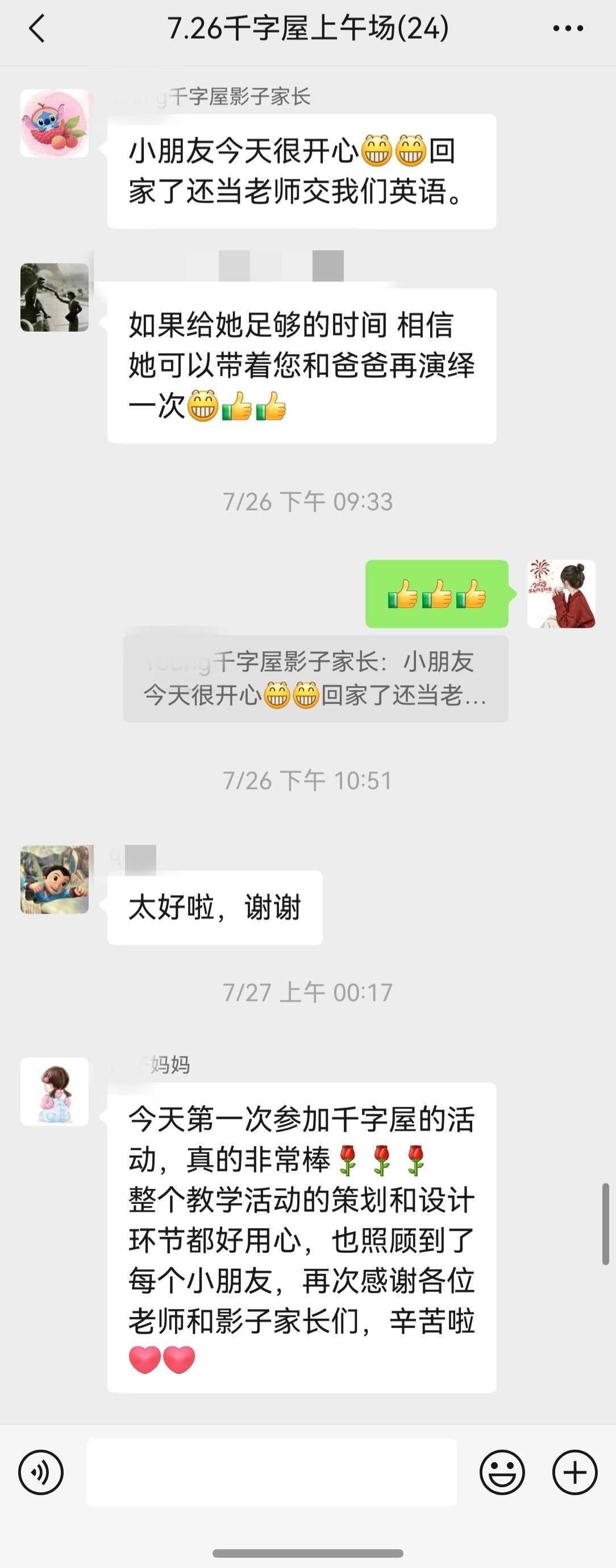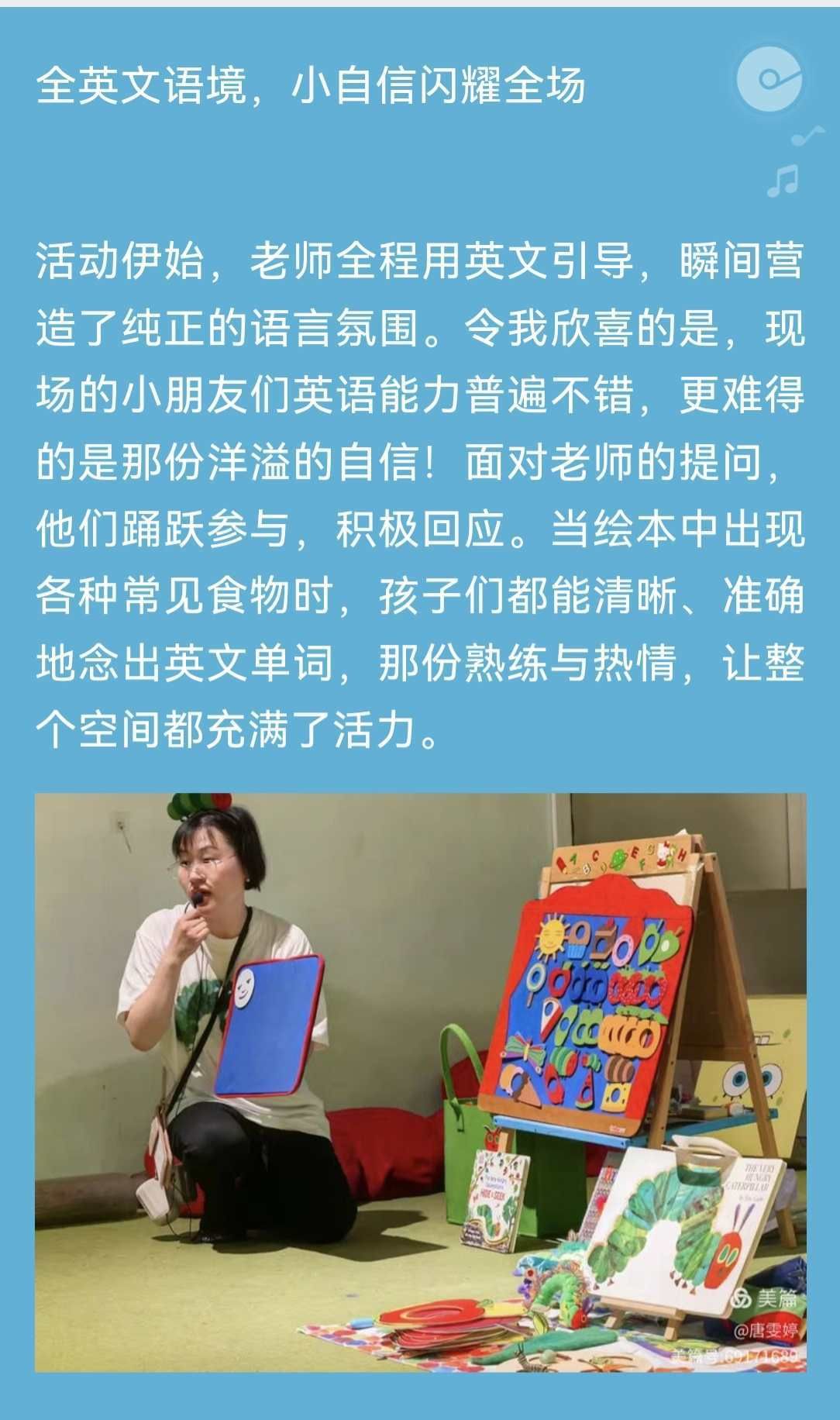 在7月26日上午英文绘本专场“An Encounter with Educational Drama ——The Very Hungry Caterpillar”活动中,本场活动以“生命蜕变”为主题,围绕经典英文绘本《The Very Hungry Caterpillar》展开,通过热身互动、英文绘本讲解、沉浸式皮影剧演绎、角色扮演及创意手工五个环节,构建了一场全方位沉浸式生命价值的体验之旅。本场活动不仅提升了孩子们的英语听说能力,更通过多感官体验帮助其深刻理解了生命的神奇与美好,培养了热爱自然、珍惜生命的情感。