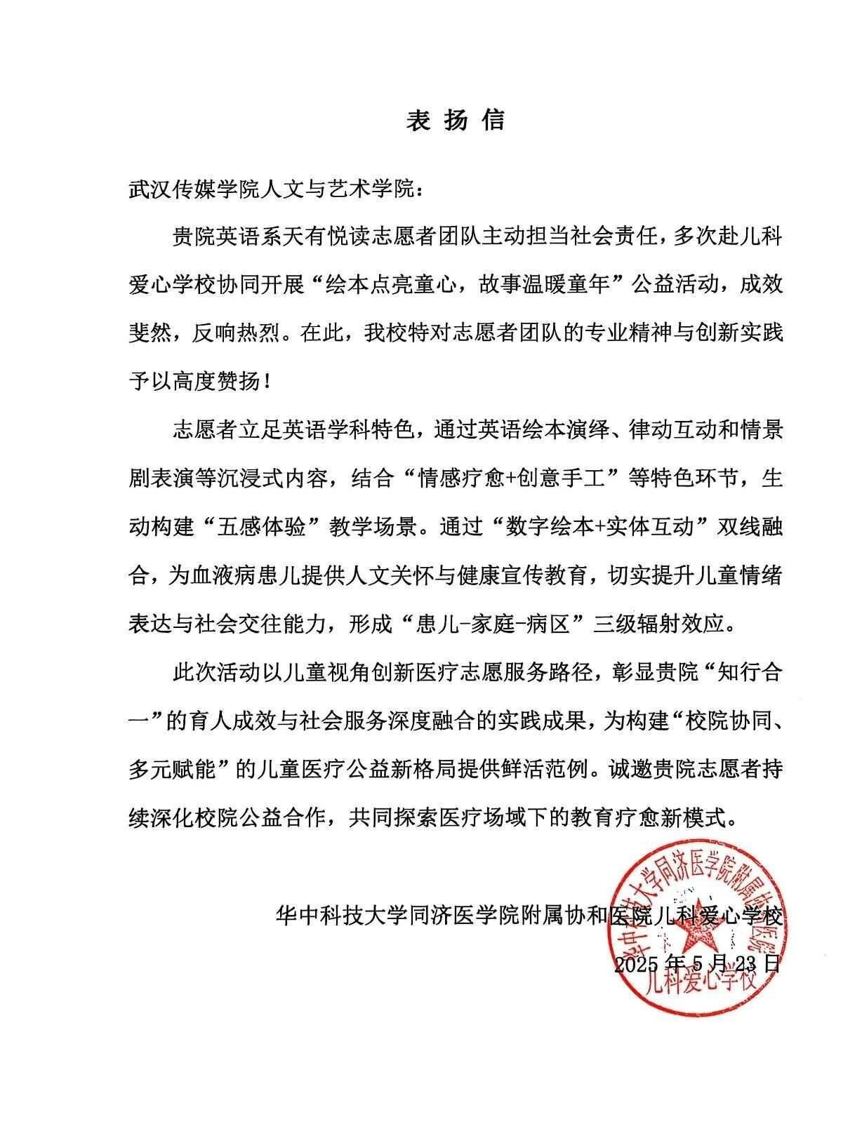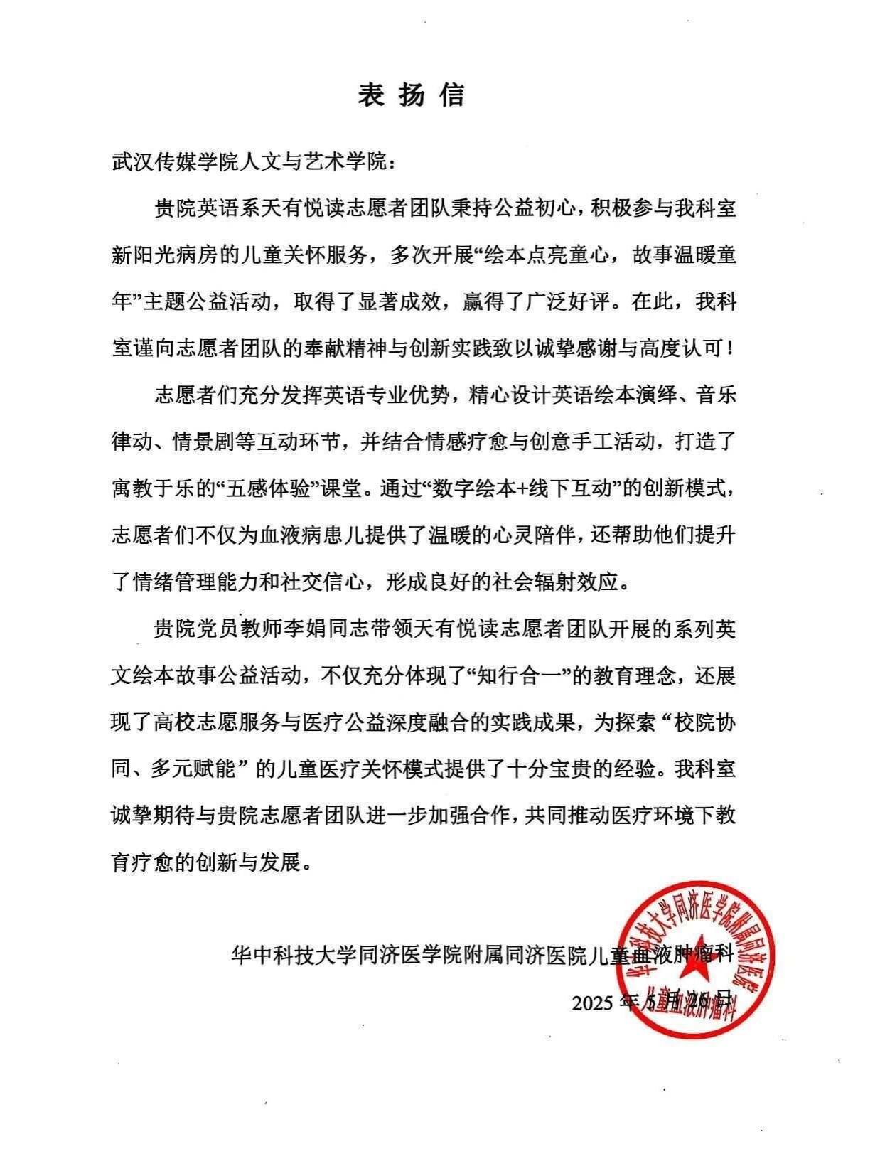 公益脚步不止于校园。自2024年11月以来,李娟老师带领“天有悦读”志愿服务队,以“Madeline”系列经典英文绘本为载体,为华中科技大学同济医学院附属协和医院儿科爱心学校和同济医院儿童血液肿瘤科患儿们带来了多场公益英文绘本故事会。通过校院协同、多元赋能的创新模式,在校园与医院之间构筑起立体化的公益服务网络,以教育温暖医疗,以故事疗愈心灵,取得了显著成效。