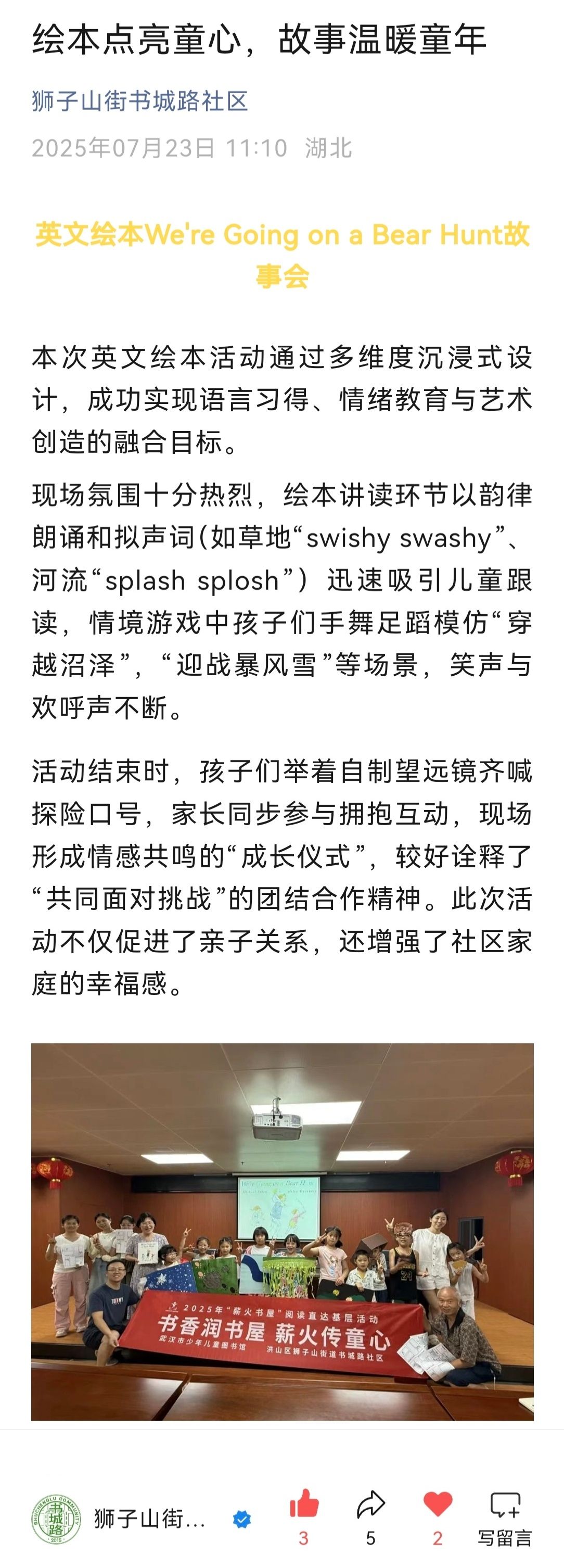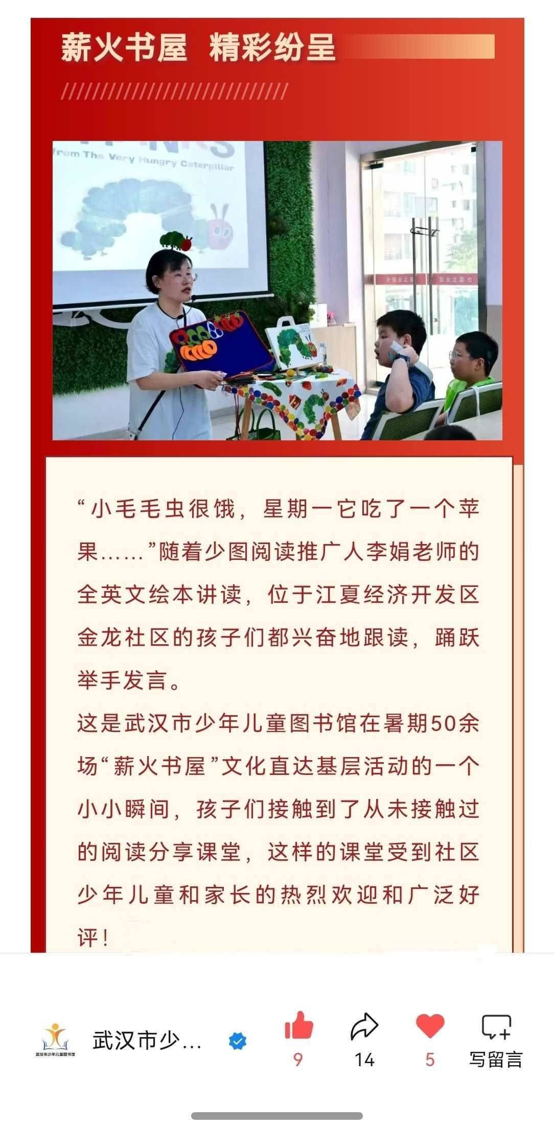 2025年7月至9月,李娟老师受邀参与“薪火书屋”阅读直达基层项目,先后走进往江夏区金龙社区、洪山区书城路社区以及东湖新技术开发区龙泉街道腾龙社区,成功组织并开展了一系列特色鲜明的英文绘本阅读活动。她将校级一流本科课程《少儿英语绘本阅读》的优质教学成果带出校园、服务社会,深受社区居民的欢迎与好评。