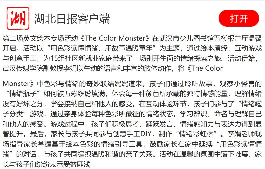 2025年7月24日,李娟老师受邀到武汉少年儿童图书馆五楼报告厅组织与开展了英文绘本阅读活动。她以英文绘本《The Color Monster》为载体,通过生动讲述、互动游戏与创意手工,在报告厅为15组来自社区的新就业家庭带来沉浸式情绪学习体验。活动中,孩子们跟随小怪兽的“情绪瓶子”认识不同颜色所代表的情感,学会接纳情绪的多样性;在“情绪罐子分类”游戏中积极表达与思考,提升情绪识别与表达能力;而在创意手工“情绪彩虹桥”环节,李娟老师指导家长们运用色彩工具开展情绪对话,助力构建温暖融洽的家庭互动氛围。整场活动得到了家长和孩子们的一致好评,不仅为孩子们提供了情感表达与创造力展示的平台,也增强了新就业群体家庭的亲子联结与情感支持。